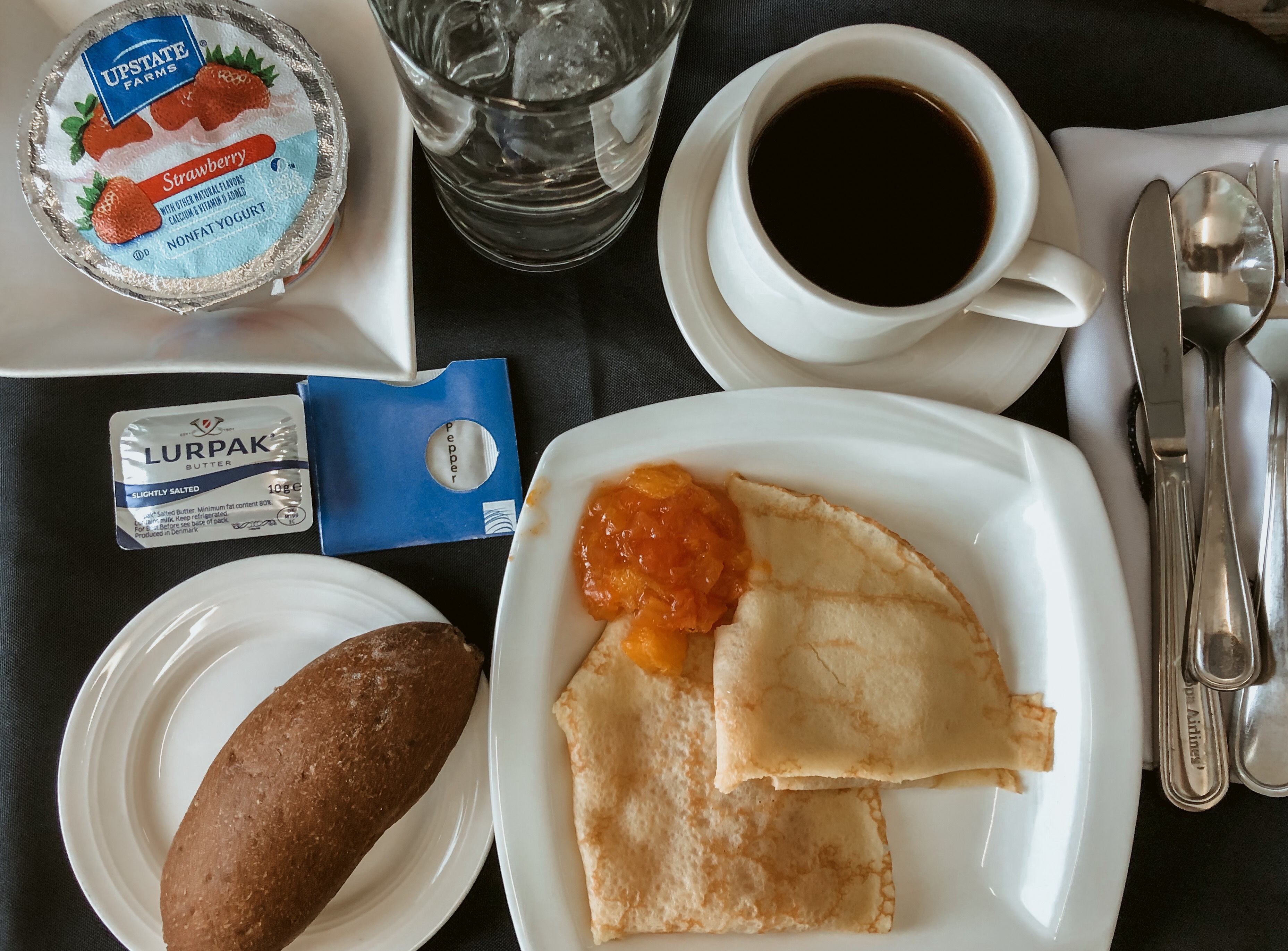 Há um atendimento exclusivo de serviço de bordo, onde foram oferecidos água na chegada, toalha úmida aquecida para limpar as mãos e café da manhã, sendo este último com duas opções: ovos ou crepe de maçã. Escolhi o crepe de maçã, que estava uma delicia, acompanhado de um pão preto com manteiga, iogurte sem gordura, café e água (a bebida também podia ser escolhida).