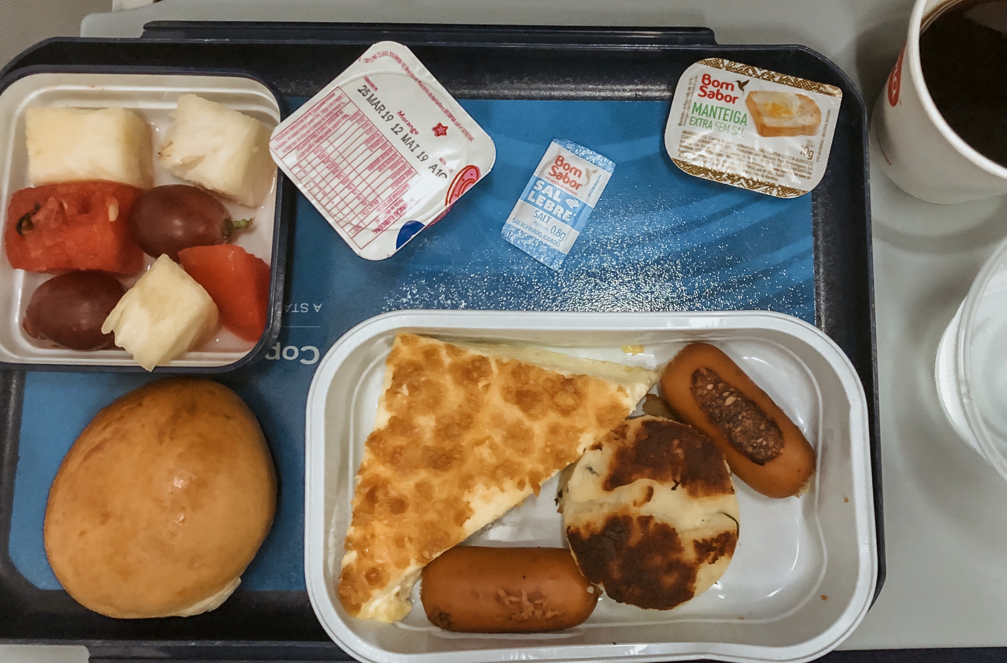 Quando amanheceu, foi servido um café da manhã que consistia em ovos, pão, salsichas, batata assada, manteiga, salada de frutas e iogurte, juntamente com opções de bebidas como café, água, chá e sucos. Estava maravilhoso!