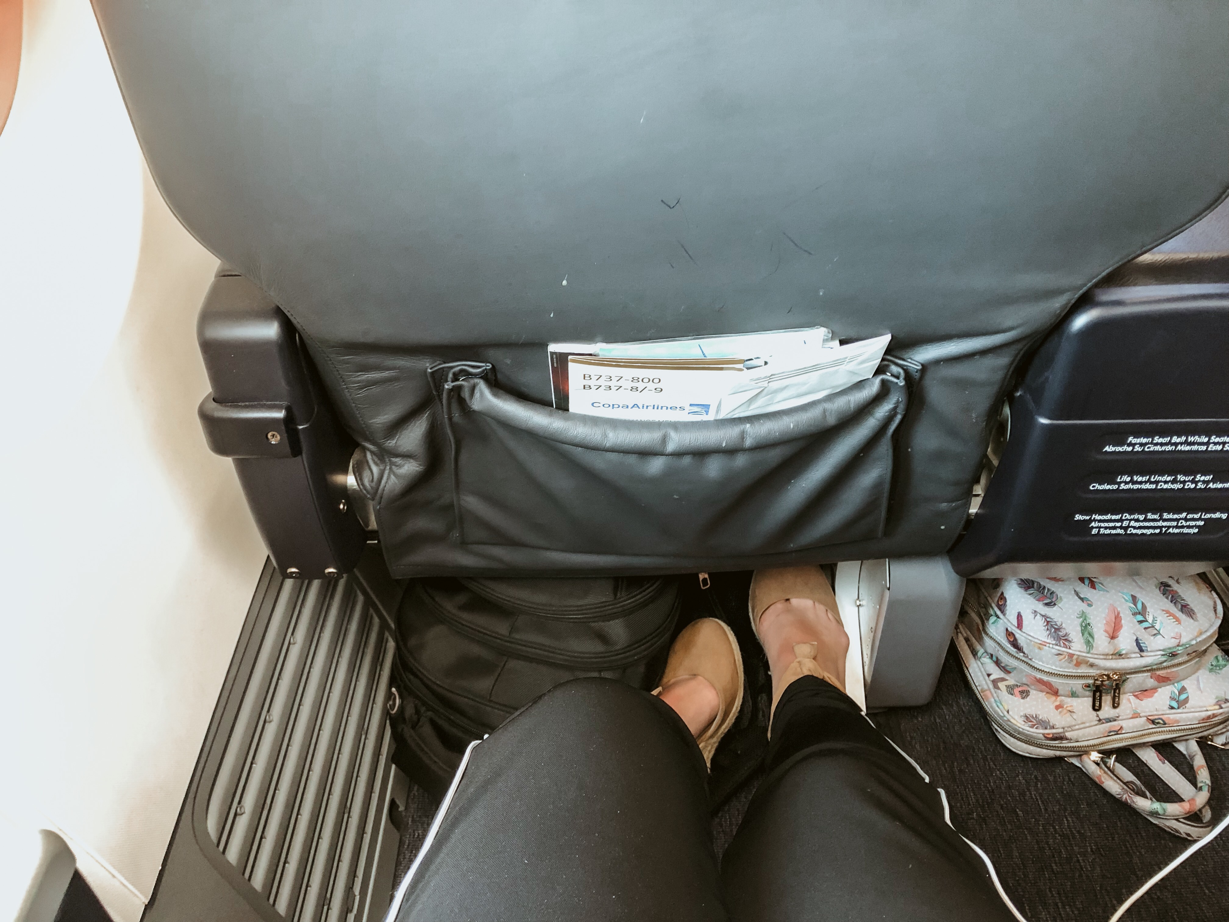Os assentos são muito confortáveis e espaçosos. Sempre guardo minha mochila embaixo do banco da frente. Não houve nenhum comprometimento no espaço para as pernas. Realmente é muito bom. Cadeiras bem reclináveis e com acabamento em couro. Você se sente literalmente abraçado pela cadeira. Não havia televisão, pois seria um voo mais curto. Era possível acessar o entretenimento da Copa Airlines pelo celular. Já o voo RJ – Panamá, que é mais longo, na classe executiva havia TV interativa obviamente.