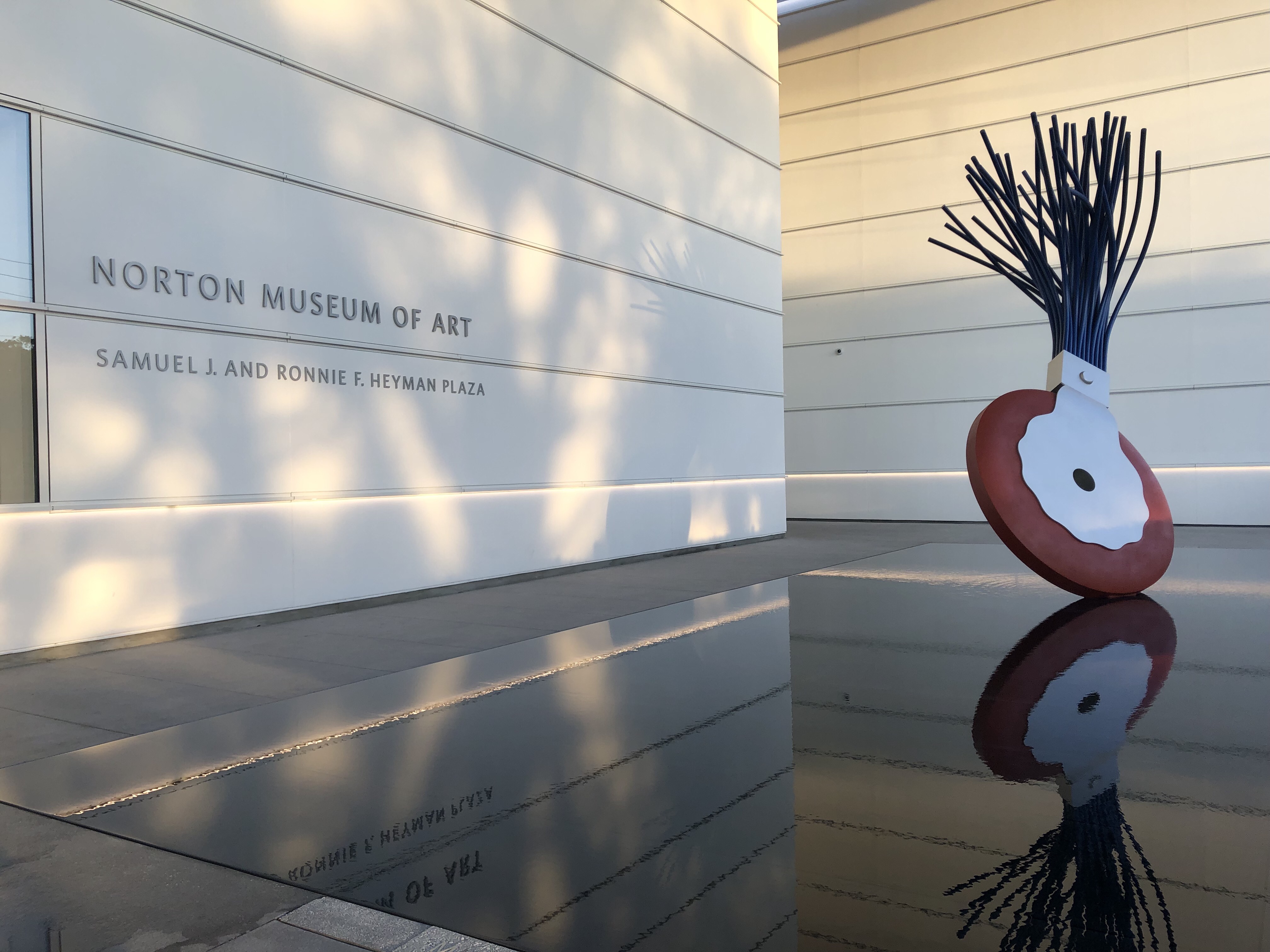 - Após este passeio, ainda em West Palm Beach, fomos jantar e conhecer The Norton Museum of Art, museu de arte com uma coleção que inclui obras europeias, americanas, chinesas, bem como arte contemporânea e fotografia. Foi recentemente reinaugurado após uma enorme reforma e esbanja beleza, principalmente em seu jardim repleto de esculturas. No interior do museu, há um restaurante formidável, The Restaurant at The Norton, que faz valer a pena combinar a visita ao museu a uma refeição neste restaurante. Optamos pela programação Art After Dark, que ocorre toda sexta-feira de 17 às 22h, onde é possível visitar o museu neste horário diferenciado.