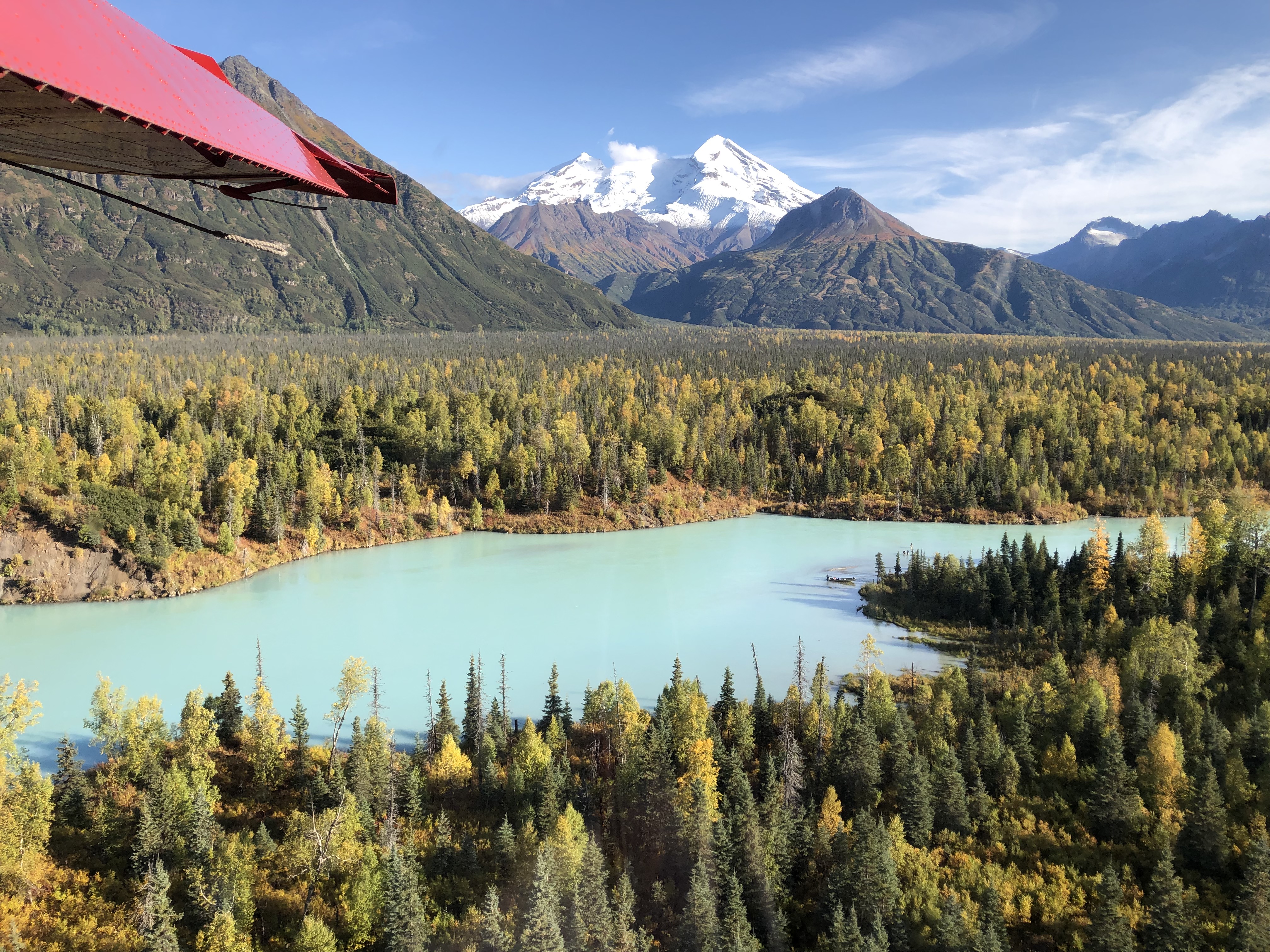 Chegamos até a base de hidroaviões Lake Hood, onde se encontra a empresa Rust’s, por volta de 8h da manhã. Fizemos check in e confirmamos a pesagem de cada um na balança da própria empresa. Depois do briefing de segurança e detalhes sobre o passeio, iniciamos o percurso de hidroavião. Pode ficar tranquilo que todos vão na janela para aproveitar a vista linda.
