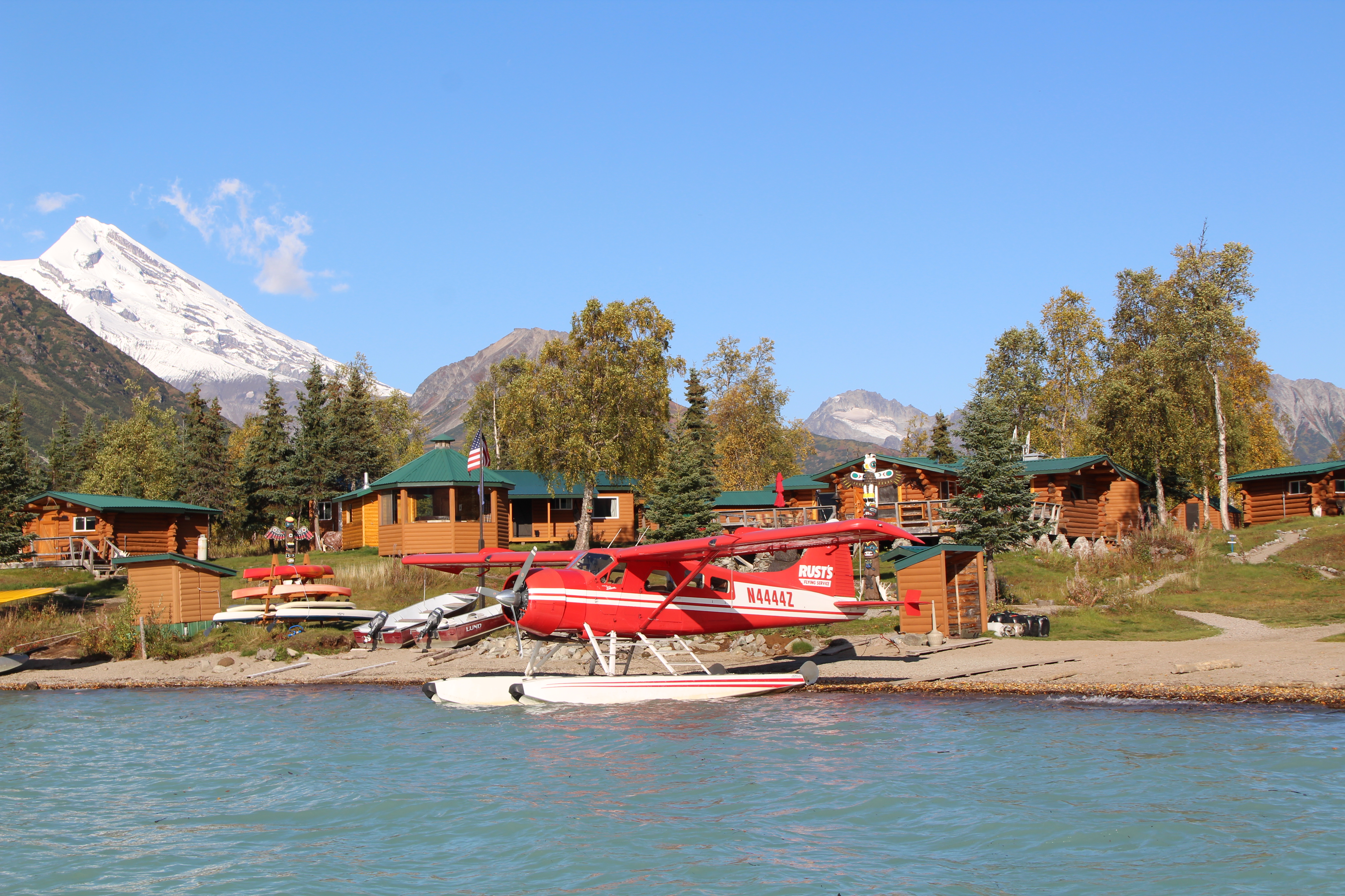 Pousamos no Redoubt Mountain Lodge, que, além de ser o local de onde parte o barco para continuação do passeio e onde voltamos para o almoço, também possui acomodações para uma experiência única e imersiva no Alasca.